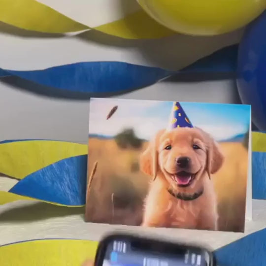 Meet the Happy Dog AR Card from Magic Paper Labs! This card magically transforms into a video with the world's cutest golden retriever puppy joyfully running towards you with its ears flapping adorably with every step. All because it's so happy it's your birthday!