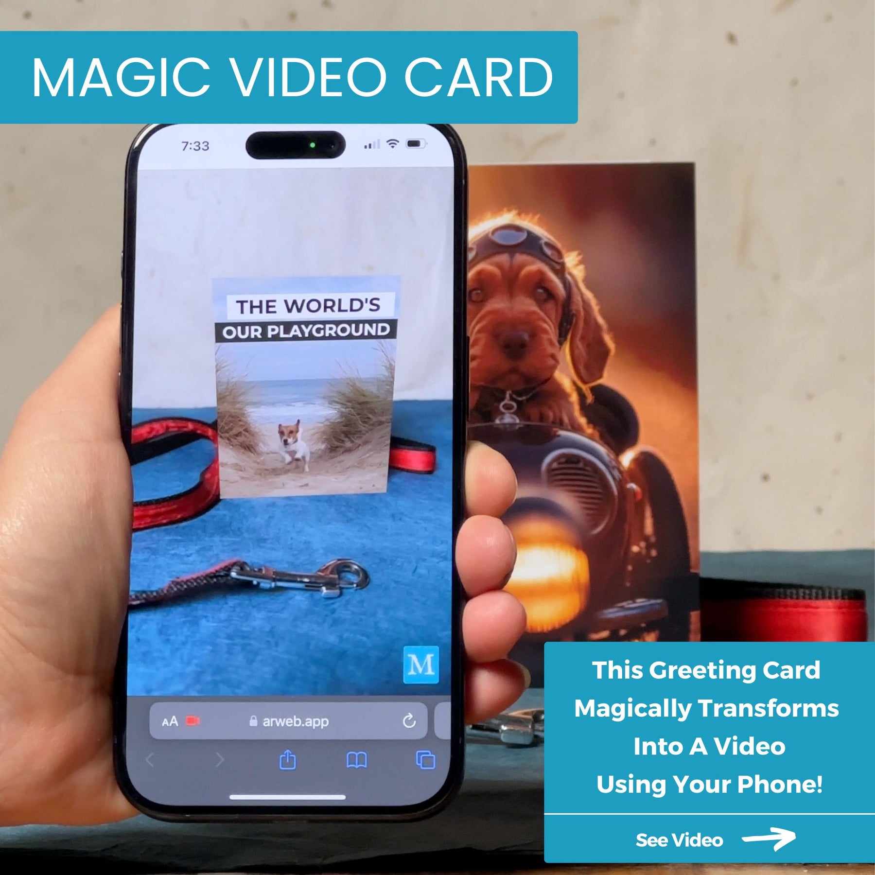 Embrace the spirit of adventure with Magic Greetings' 'Sidecar Dog' AR video greeting card. This adorable puppy card comes to life when you scan the QR, magically transforming into an inspiring message to wag more, bark less, and get ready for the next big adventure, reminding us to live life to the fullest.