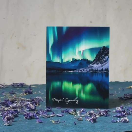 Offer a heartfelt gesture of compassion with Magic Greetings' 'Sympathy Northern Lights' AR video greeting card. This solemn and beautiful card serves as a gentle embrace, conveying strength, love, and light through the serene dance of the northern lights accompanied by poignant piano melodies.